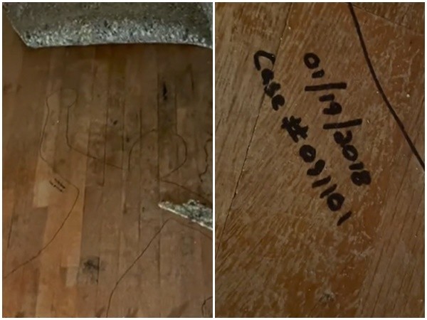 美國一名女網友在新家整理翻修時,發現某房間地毯被黏住,奮力撕開後,竟看見木頭地板上出現一個用麥克筆畫的「人形輪廓」,旁邊寫著日期「2018年1月19日」與「第091101號案件」(Case #091101),甚至還有一大片不明深色污漬,種種跡象像極了命案現場。她將此場景拍攝下來並分享至TikTok,立刻引發熱烈討論。