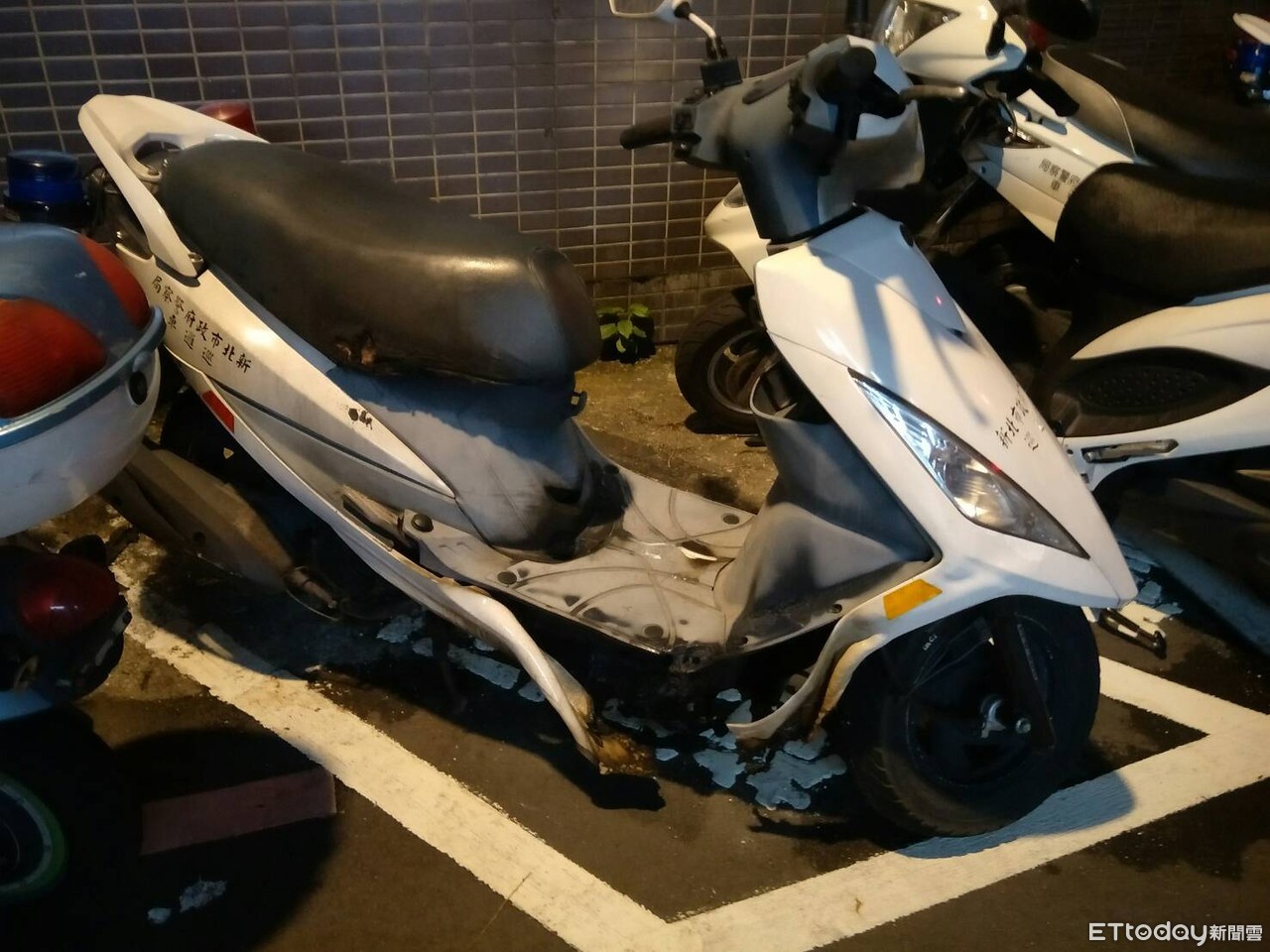 18日晚間11時許,有民眾跑進新北市永和警分局得和派出所,大喊「你們停在門口的警用機車著火了」,值班警員立即拿滅火器衝出去滅火,所幸機車僅部分車殼毀損,旁邊電動機車手把及安全帽部分被燒焦。