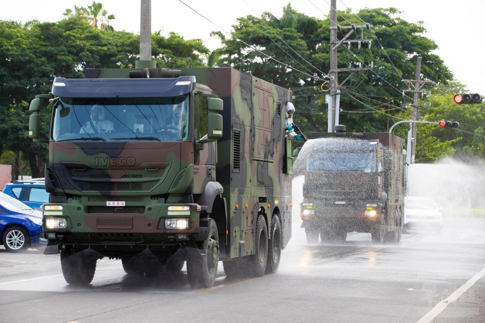 ▲39化學兵群使用「MS-105重型消毒車」,在屏東地區執行消毒作業。(圖/軍聞社,下同。)