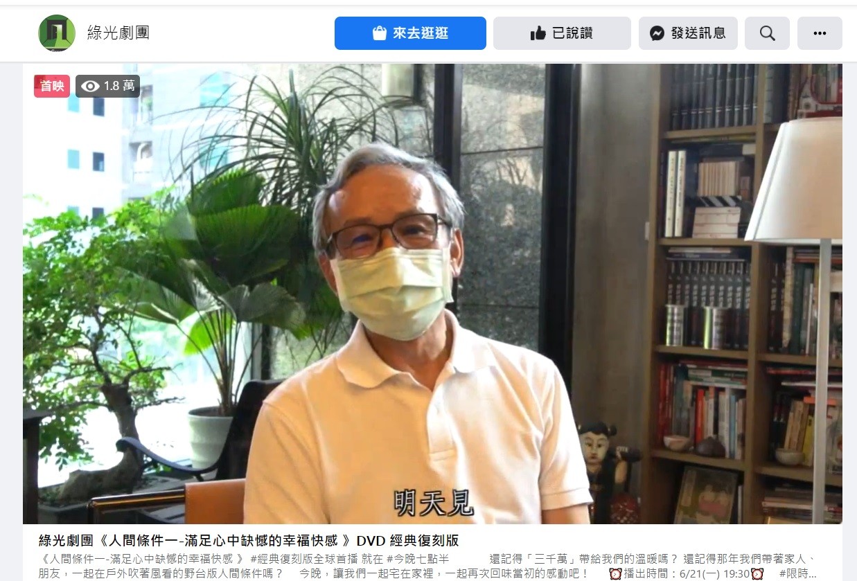 綠光劇團昨(21)日起直播《人間條件》系列,首播第1集超過4萬人同時在線上觀看,在臉書、YouTube兩個平台累積至今(22)日中午超過30萬人次,而過程中粉絲也狂刷留言「謝謝綠光!」,不少人更透過「賞星星」支持,紛紛說「好懷念」、「太感動了」、「吳導謝幕太暖了!」