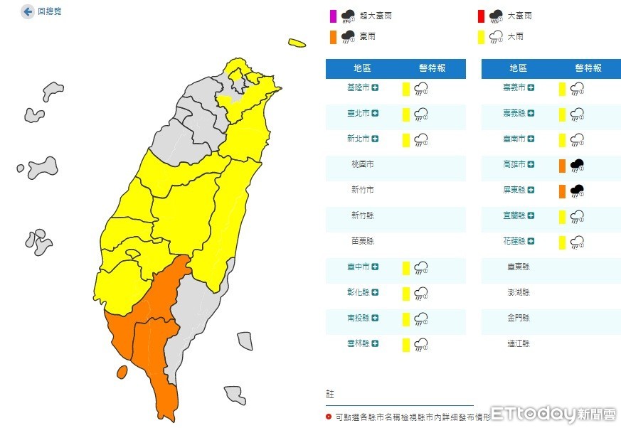 ▲氣象局發布14縣市豪大雨特報。(圖/中央氣象局)