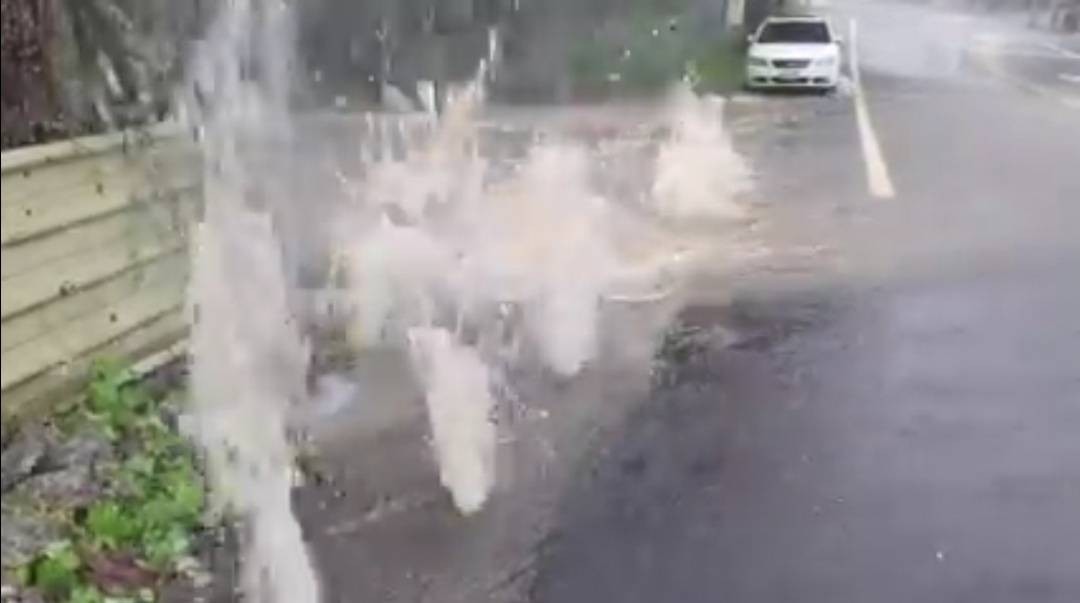 彰化連續2天降下暴雨,21日在八卦山花壇、芬園交界造成道路坍塌,百果山旁的山溝在雨水強灌下噴出強力水柱,22日彰員路又開始淹水,水溝水勢湍急並溢流路面,機車涉水而過,險象環生。