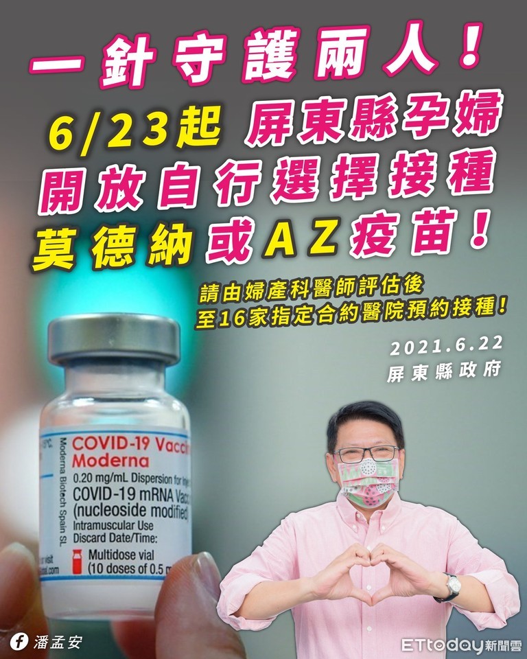 屏東連15天+0,縣長潘孟安臉書宣佈「一針守護兩人」!明天(23日)起「屏東縣孕婦」開放自行選擇接種「莫德納或AZ疫苗」。