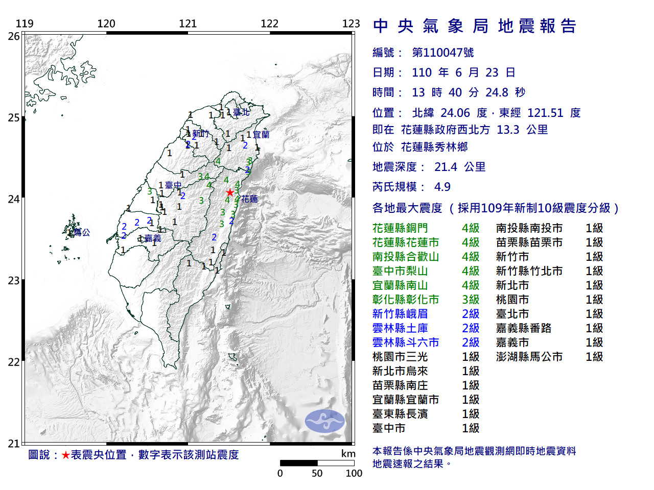 花蓮縣今日發生規模4.9地震,台鐵東部幹線受影響,鳳林=崇德間列車延誤。台鐵局表示,受花蓮地區地震影響,臺鐵自13:50起,鳳林=崇德間上、下行各次列車皆有延誤。受影響車站包括鳳林、南平、林榮新光、豐田、壽豐、平和、志學、吉安、花蓮、北埔、景美、新城、崇德等13站。