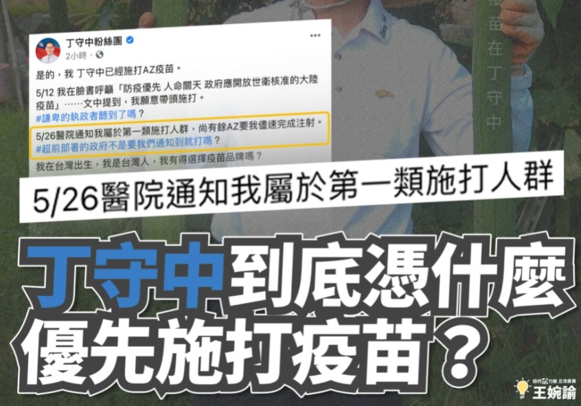 國民黨前立委丁守中23日證實已接種AZ疫苗,原因是5月26日時醫院通知他屬第一類施打人群,且尚有餘AZ疫苗,因此要他儘速完成注射。對此,時代力量立委王婉諭批評,丁守中憑什麼優先施打疫苗?不僅令人心寒且無法接受,更再次凸顯台灣接種順序有多荒唐。