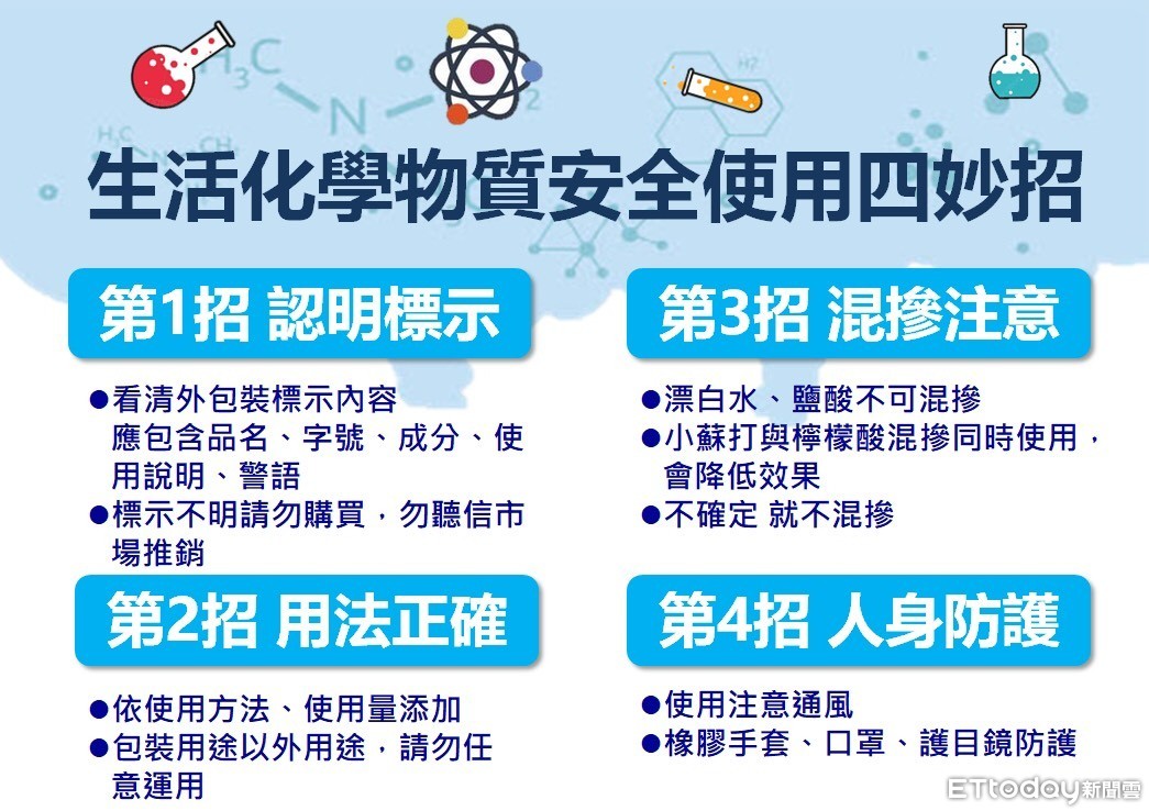 ▲漂白水混摻化學物質使用,務必參照「生活化學物質安全使用四妙招」,才能有效並安全的消毒。(圖/花蓮縣政府提供)