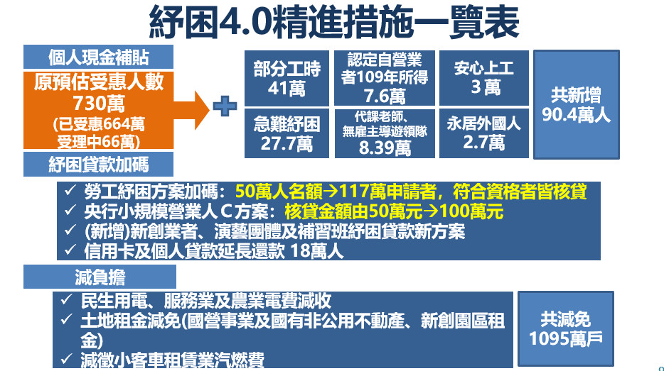 行政院今(24)拍板「紓困4.0執行成果及精進作為」,其中精進作為分為4大面向,包含資格認定放寬型、加碼型、新增型,以及減輕負擔型,預計可讓108.3萬人次可獲共206.2億元加碼補助、1,095萬戶可減收約74.4億元。