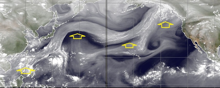 鄭明典PO文分享衛星水氣頻道圖,現在太平洋上一條邊界清楚、平滑的水氣帶,由南海上空區域,一直延伸到北美洲加拿大西岸,綿延1萬多公里。其中,白色部分是上對流層的水氣,越白表示水氣越高。