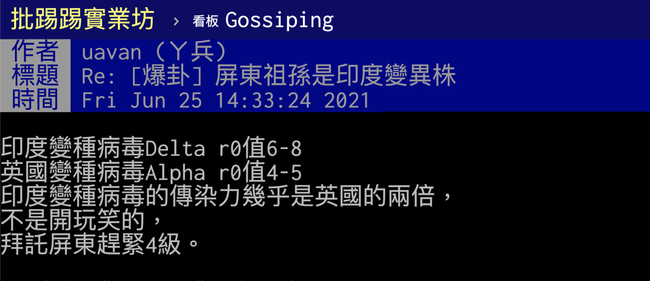 ▲印度Delta病毒入侵屏東,引起網友一片震撼。(圖/翻攝自批踢踢八卦板)