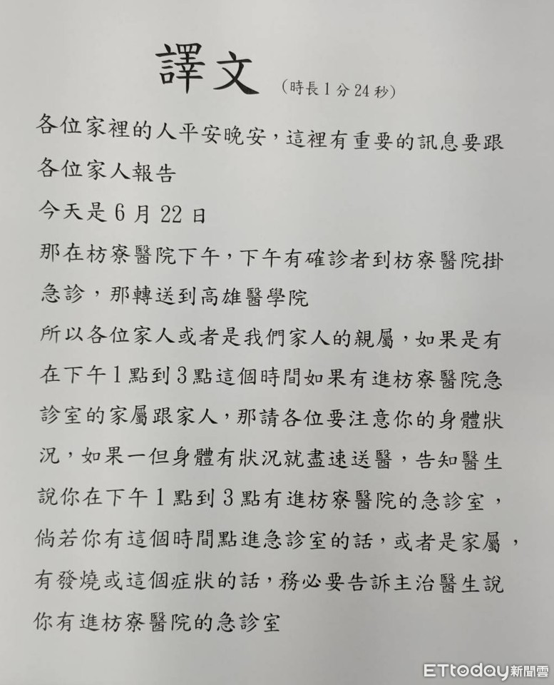 枋寮警分局獲報後,即通知枋寮醫院公關負責人到案說明,並依法查辦,枋寮醫院公關負責人表示,6月23日12時許陸續收到民眾將該語音檔案傳至該院臉書(FACEBOOK)詢問真實性而得知,並證實該訊息為「假訊息」,但對製造及涉嫌傳播者並未提出告訴。