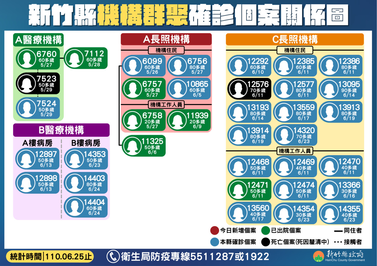 案14567則為本國籍80多歲男性,住關西鎮,6月8日因肺炎至國軍桃園總醫院住院,入院時PCR採檢陰性,19日再度採檢又陰性,22日因為照服員確診被匡列隔離並採檢,結果陰性,24日醫院再度針對高風險對象採檢,結果陽性確診,收治醫院隔離病房。匡列接觸者1人,為個案陪病的妻子,列居家隔離。