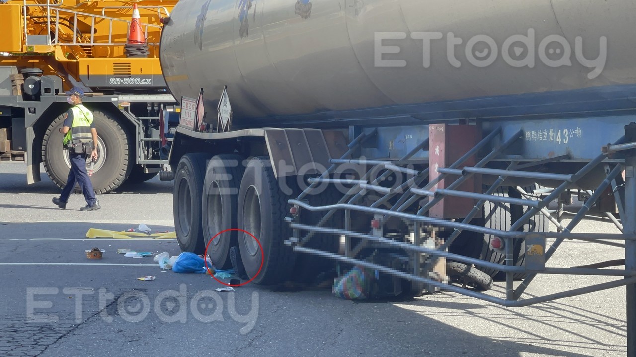 高雄市前鎮區擴建路在下午三點左右發生一起死亡車禍,一名婦人騎機車被一輛要轉彎的化學槽車當場輾斃,婦人還被壓在輪胎底下,無法移動,現在鑑識人員已經到場進行採證,而肇事的司機也被帶往分局進行筆錄。