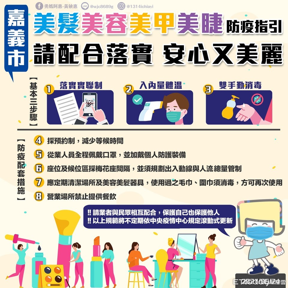 嘉義市政府24日起取消美甲美睫業者的營業禁令,呼籲相關業者必須嚴格落實實聯制、梅花座、器具消毒等防疫措施,務必做到滴水不漏,才能讓全體市民安心。嘉義市長黃敏惠表示,雖然中央沒有限制,但嘉義市的人口密度僅次於台北市,因而決定超前佈署,在2周前疫情嚴峻時刻公告暫停美甲美睫業者營業。24)日公告美甲美睫業者營業以後的防疫指引,呼籲業者與消費者都應該嚴格遵守落實,若消費者拒絕配合,店家也應該拒絕提供服務。