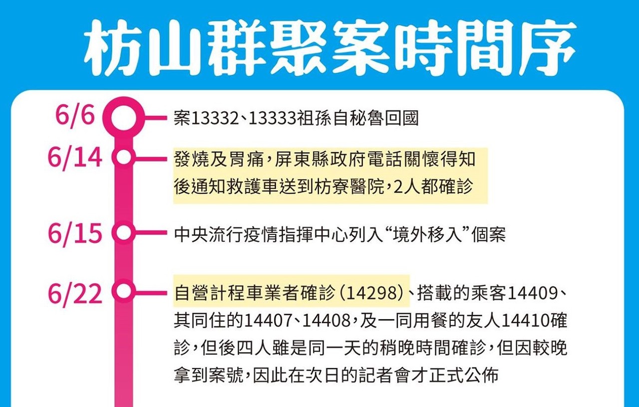 本月22日,屏東縣府指出在此以前,當局已知悉有2位台中市民在枋山居檢確診,但並未接獲疫調單位通報此案有接觸者。直到22日枋山出現第一例確診個案是白牌計程車司機,23日公布後縣府疫調人員察覺不對勁,擴大疫調才發現該位白牌計程車乘客之一,就是住在祕魯祖孫家隔壁的親戚,因而才主動緊急採樣送基因定序比對,才成功將原本疫源不明的感染鏈串起。