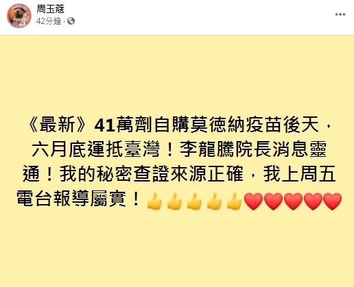 ▲周玉蔻爆料41萬劑莫德納疫苗30日抵台。(圖/翻攝自Facebook/周玉蔻)