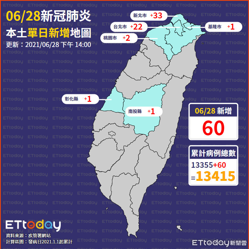 中央流行疫情指揮中心今(28)日公布國內新增60例確定本土病例,另新增3例死亡。目前連續4天都是雙位數確診,看起來有往下降的趨勢,但指揮官陳時中強調,大家還是不要掉以輕心。《ETtoday新聞雲》製作「2021年新冠肺炎全台本土病例分佈圖」,以地圖方式呈現數據,方便讀者迅速掌握全台最新狀況。
