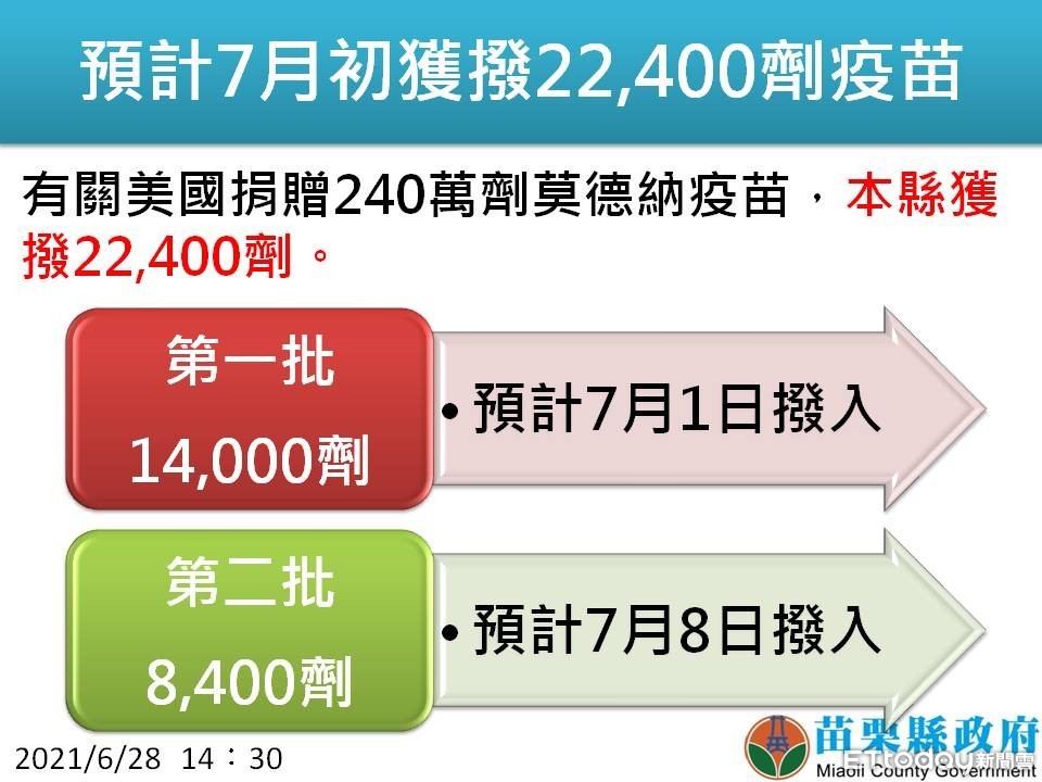 至於民眾所引頸期盼的莫德納疫苗,美國捐贈240萬劑,苗栗苗栗獲撥22400劑,第一批14000劑,預計7月1日撥入,7月8日配送8400劑,疫苗接種細節及規畫,縣府將進一步開會討論並公布。