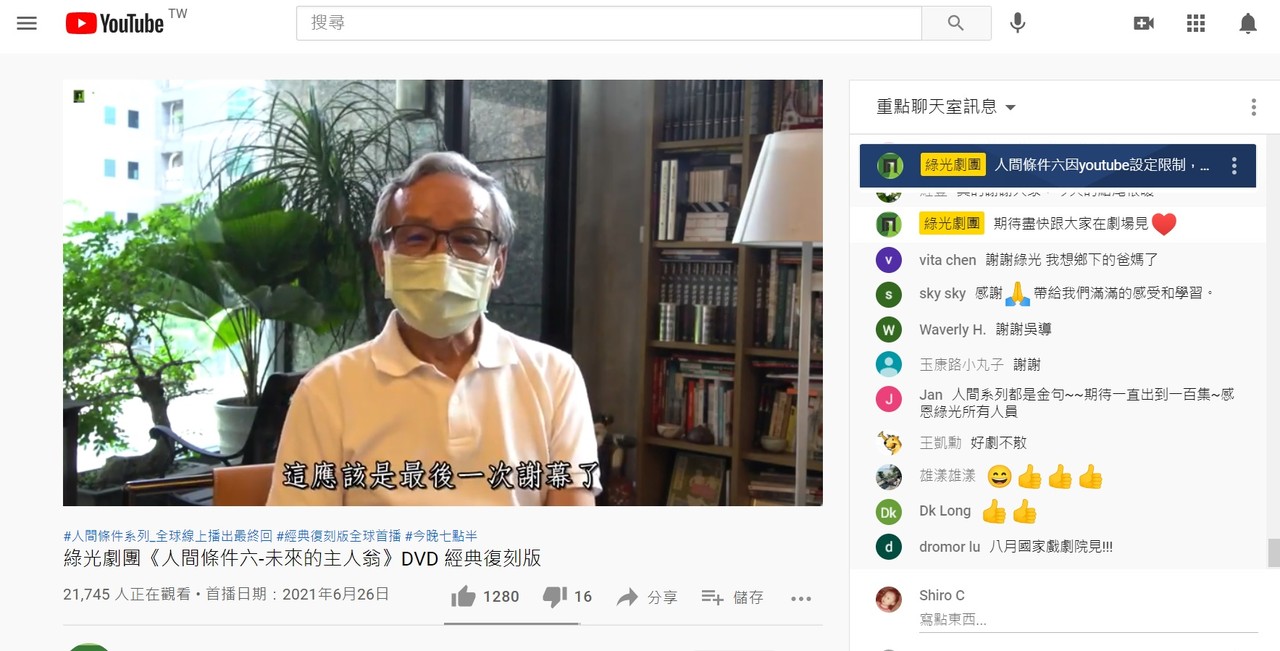 綠光劇團自上週21日起在臉書、YouTube頻道播出《人間條件》全系列1至6集,每集上架後停留48小時讓所有人免費欣賞,28日播畢,該劇憑藉平實生活化的對白、真摯人情味,讓海內外戲迷都深受吸引,每晚聚集了世界各地的粉絲,甚至藝人、名人、地方首長、民意代表都一同在線觀看。