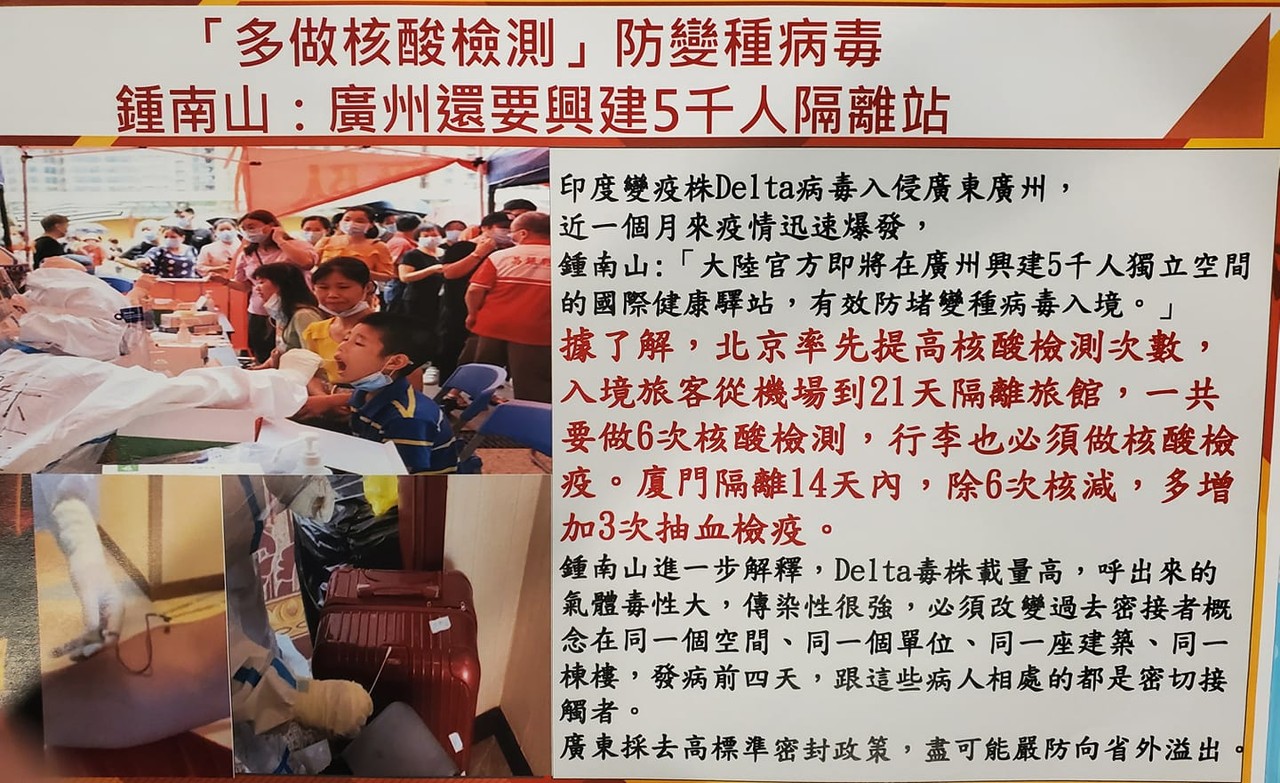 同時,黃光芹分享貼出一張中國大陸對抗Delta的海報。該篇海報內容提到,印度變疫株Delta入侵廣東廣州,造成疫情迅速爆發,大陸官方要在廣州興建5000人獨立空間的國際健康驛站,有效防堵變種病毒入境。