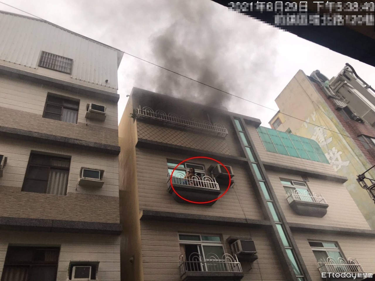 ▲高雄市前鎮區一棟民宅冒黑煙,2人站陽台等救援 。(圖/記者許宥孺翻攝)