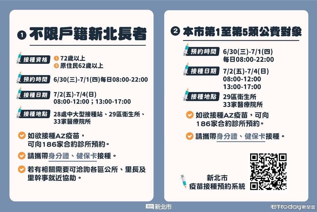 新北市新一批莫德納30日開放預約,對象包括72歲以上長者及1至5類公費對象,於7月2至4日施打,施打地點為新北市28處中大型接踵站、29區衛生所、33家醫療院所施打。