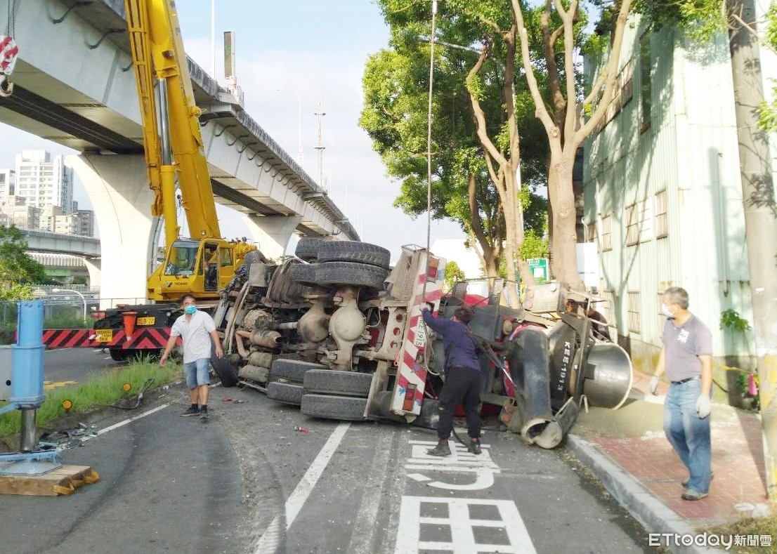 ▲桃園市龜山區30日下午發生水泥車與小貨車在文化三路、龜山一路口重大車禍,救難人員緊急將水泥車扶正移除現場。(圖/記者沈繼昌翻攝)