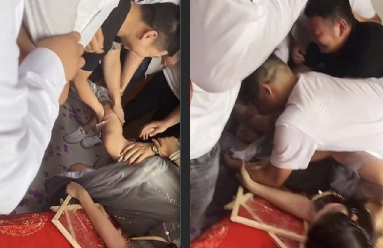 大陸惡俗婚鬧屢禁不止!微博近日就熱傳一段影片,再次引發微博一片罵聲。短短幾秒的影片中,一名身穿裙子的伴娘在迎親儀式上,慘遭到多名噁男重壓在床。據悉,新郎男親友大玩拔腿毛遊戲,但直接掀開女孩的裙子,致她雙腿裸露,全程嘻笑聲不斷。