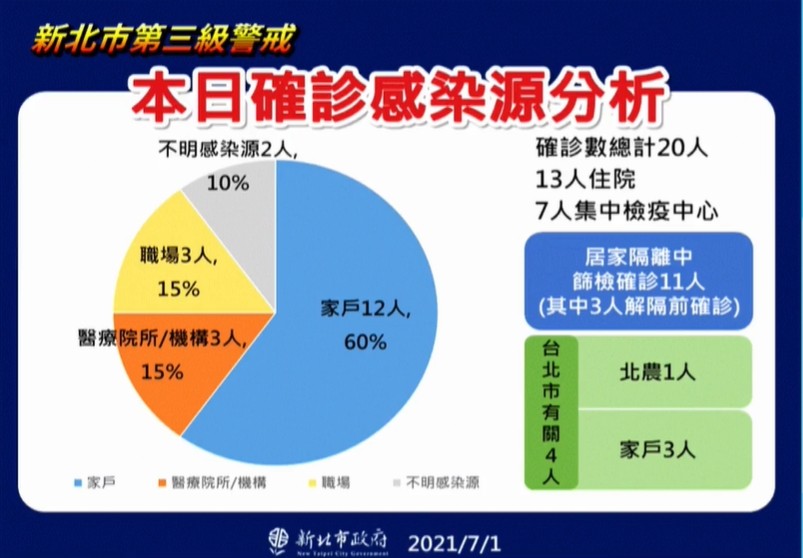 進一步分析感染源,侯友宜說明,家戶感染有12人,佔6成,職場3人、醫療院所有3人,另外,跟北市有關的有4人,其中1人在環南市場工作染疫,另外三人則是家戶感染,其中一人是兒子在台北某醫院擔任看護,染疫後傳給媽媽,另一案則兒子住在萬華區,回三峽後傳染給母親以及印尼照護員,三峽今天新增3例的感染源非常清楚,也立即啟動跨縣市疫調。