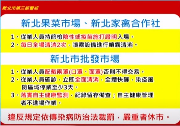 侯友宜說明,新北果菜市場、新北家禽合作社從業人員必須持篩檢陰性或疫苗施打證明入場,每日全場清消2次,並使用噴霧設備消毒。