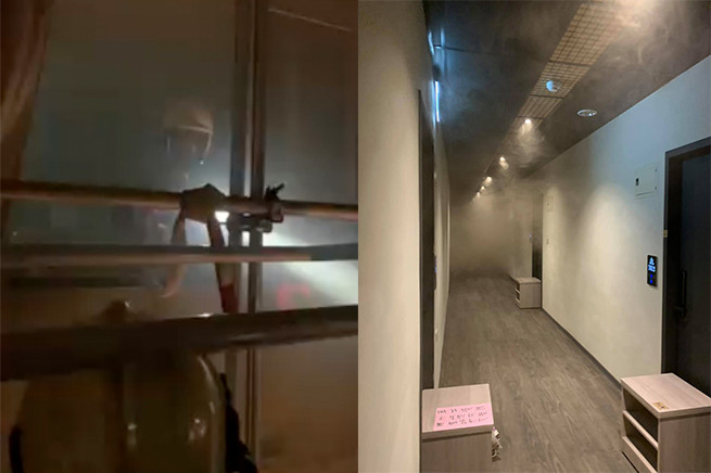 大概八點時,房門外傳來許多躁動聲,有些受不了的房客們離開房間,我隔著房門聽到一些窸窸窣窣,後來對話聲越來越清晰,大家越來越驚慌。我打開房門,想要了解外面的狀況,但發現走道上煙霧,可以看到的視線已經越來越模糊,我終於意識到,這是真的出事了。