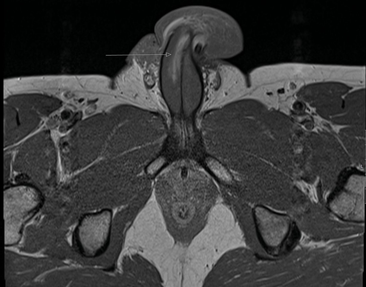 ▲依據MRI掃描,醫師發現患者陰莖右側有一處3公分長的垂直受傷處。(圖/翻攝自《英國醫學期刊》)