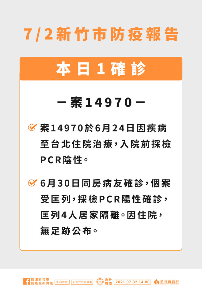 林智堅市長表示,案14970因本身疾病,6月24日入住台北某醫院治療,入院前PCR採檢陰性,6月30日因同房病友確診,個案被匡列、並進行PCR採檢陽性確診,在原醫院進行治療。目前匡列其陪病家屬1人,在原醫院進行居家隔離,另匡列新竹市同住家人3人於防疫旅館居家隔離。