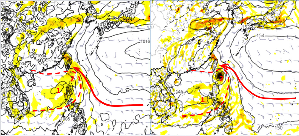 ▼最新(2日20時)歐洲(ECMWF)模式,模擬下週一(5日) 20時地面圖(左圖)顯示,有大而鬆散的「低壓環流」(紅虛線)進入南海;呈現2個環流中心,主中心(紅1)在南海發展,副中心(紅2)則在巴士海峽,台灣受東南風影響(紅箭)。美國(GFS)模式亦有類似的模擬(右圖),但以在巴士海峽的中心強度較強。(圖/翻攝三立準氣象· 老大洩天機)
