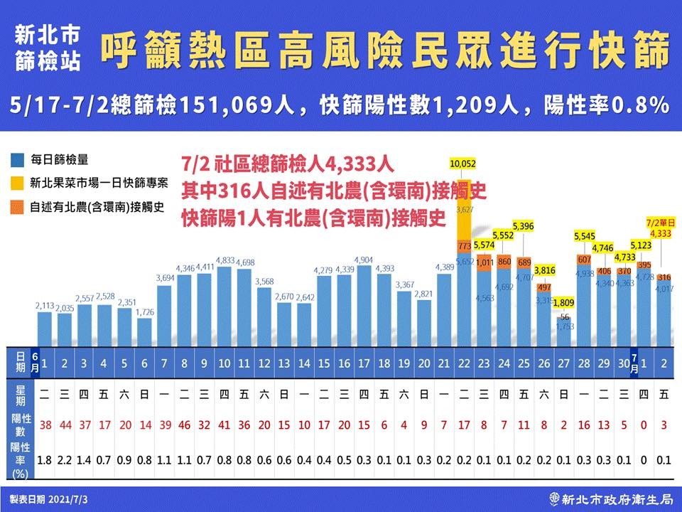 中央流行疫情指揮中心今(3)日公布國內新增80例COVID-19確定病例,分別為76例本土及4例境外移入;另確診個案中新增10例死亡。針對近日快篩結果,新北市長侯友宜說明,2日共有4333人篩檢,其中有316人自述有北農、環南接觸史,1例陽性,最新陽性率為0.8%。
