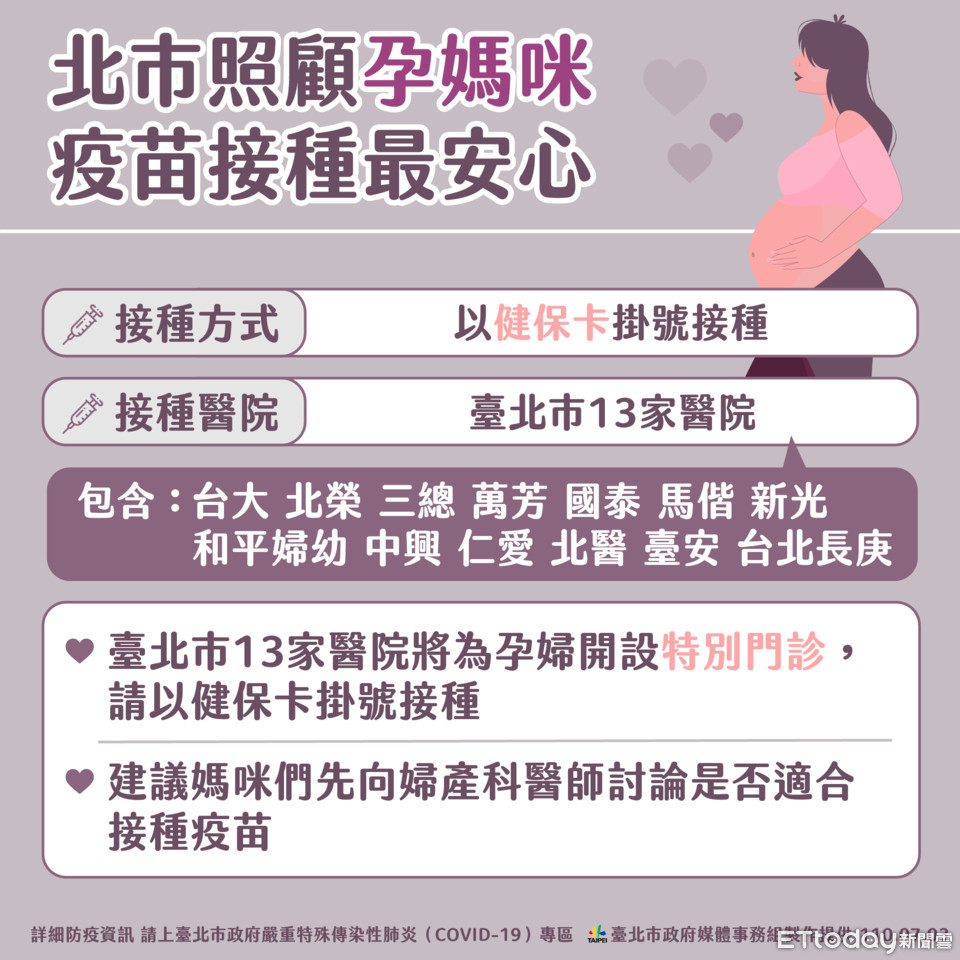 蔡炳坤說明,台北市政府已經在13家醫療院所開設特別門診,包括醫學中心、區域醫院等,孕婦們只要帶著健保卡到醫院掛號就可以接種。