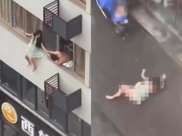 影片顯示,女子穿著睡衣坐在4樓的窗戶外,一名上身赤裸的男子探出窗外,緊緊地抓住女子的手臂,看起來似乎在勸女子回去,但女子突然刻意將屁股往前移,導致整個人瞬間墜落。