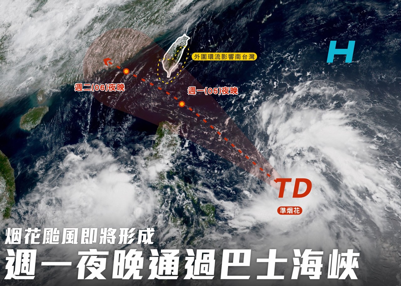 氣象局預報員張承傳表示,熱帶性低氣壓未來會以較快速度朝巴士海峽前進,抵達廣東一帶,周一下半天到周二通過巴士海峽這段時間,有時間發展成輕颱烟花,同時也距離台灣最近。但由於未來環境不利發展,氣象局預估最多達輕颱下限。