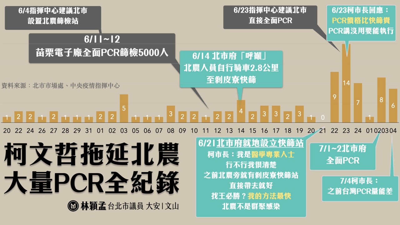 林穎孟指出,如果柯文哲真意識到已有大規模PCR量能幫北農檢測,就不會6月14日還只是「呼籲」北農人員自行騎車去2.8公里外的剝皮寮快篩,也不會在21日被發現北農群聚後仍用快篩打疫苗,更不會在23日指揮中心建議北農應全面PCR時,回應 PCR太貴了,北農比較特別、難執行,直到7月1日,才終於開始大規模PCR。