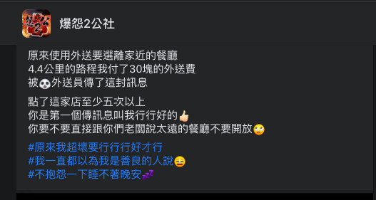 一名網友在臉書社團「爆怨2公社」發文表示,「原來使用外送要選離家近的餐廳,4.4公里的路程我付了30塊的外送費,被外送員傳了這封訊息。」只見附圖中,外送員竟傳訊跟原PO說,「老闆,拜託一下行行好,以後點餐的時候可以看一下店家的距離嗎?」言外之意即是覺得跑這4.4公里的單非常不划算。