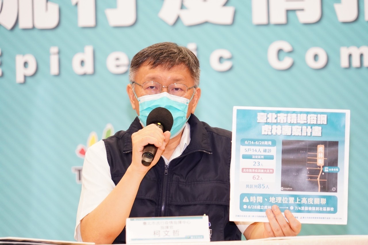 關於中正區某國宅爆確診,柯文哲指出,中正區數字有上升,忠勤里從5月18日到7月1日,6棟700餘戶國宅,1個月多時間陸續有16案,上個禮拜突然出現3人,一時間沒有看到很明確的感染源,所以認為這個地區有潛藏的不明感染源,現在里長造冊,一車一車拉到和平醫院篩檢。