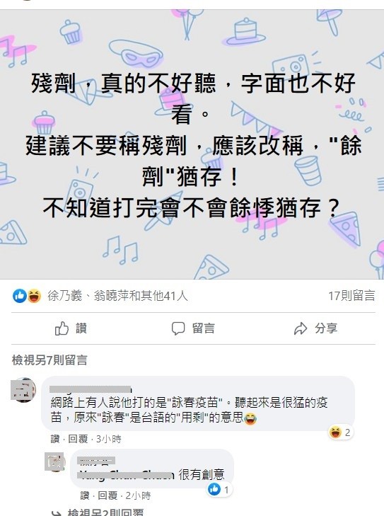 該名陳姓臉友於臉書指出:「殘劑,真的不好聽,字面也不好看」,提出更名為「餘劑」看法,意味(餘悸猶存),引發網友紛紛按讚!並有臉友回應說:網路上有人說他打的是「詠春疫苗」,乍聽之下是很猛的疫苗,原來「詠春」是台語的"用剩"的意思,很有創意!
