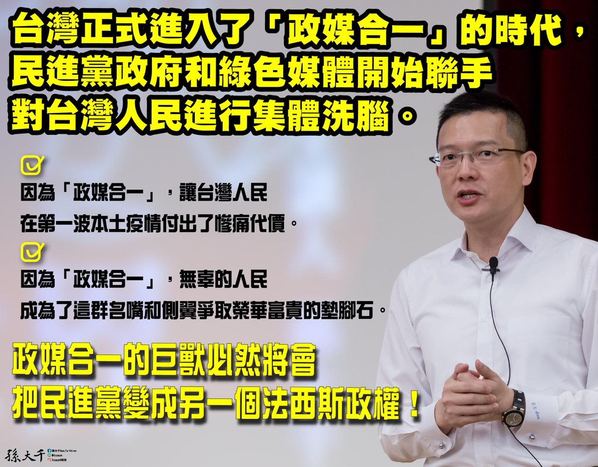 孫大千提到,也因為政媒合一,所以,綠營名嘴和側翼自恃戰功彪炳,自我膨脹到極點,「所以,會有名嘴透過管道向總統府要求莫德納疫苗;所以,當內部矛盾導致大規模火拼時,名嘴可以點名威脅蔡英文表態選邊站;所以,名嘴往往能夠在每天指揮中心記者會之前提早披露訊息;所以,連施景中這樣的醫界人士都會受到誤導,而做出了錯誤的評論。」