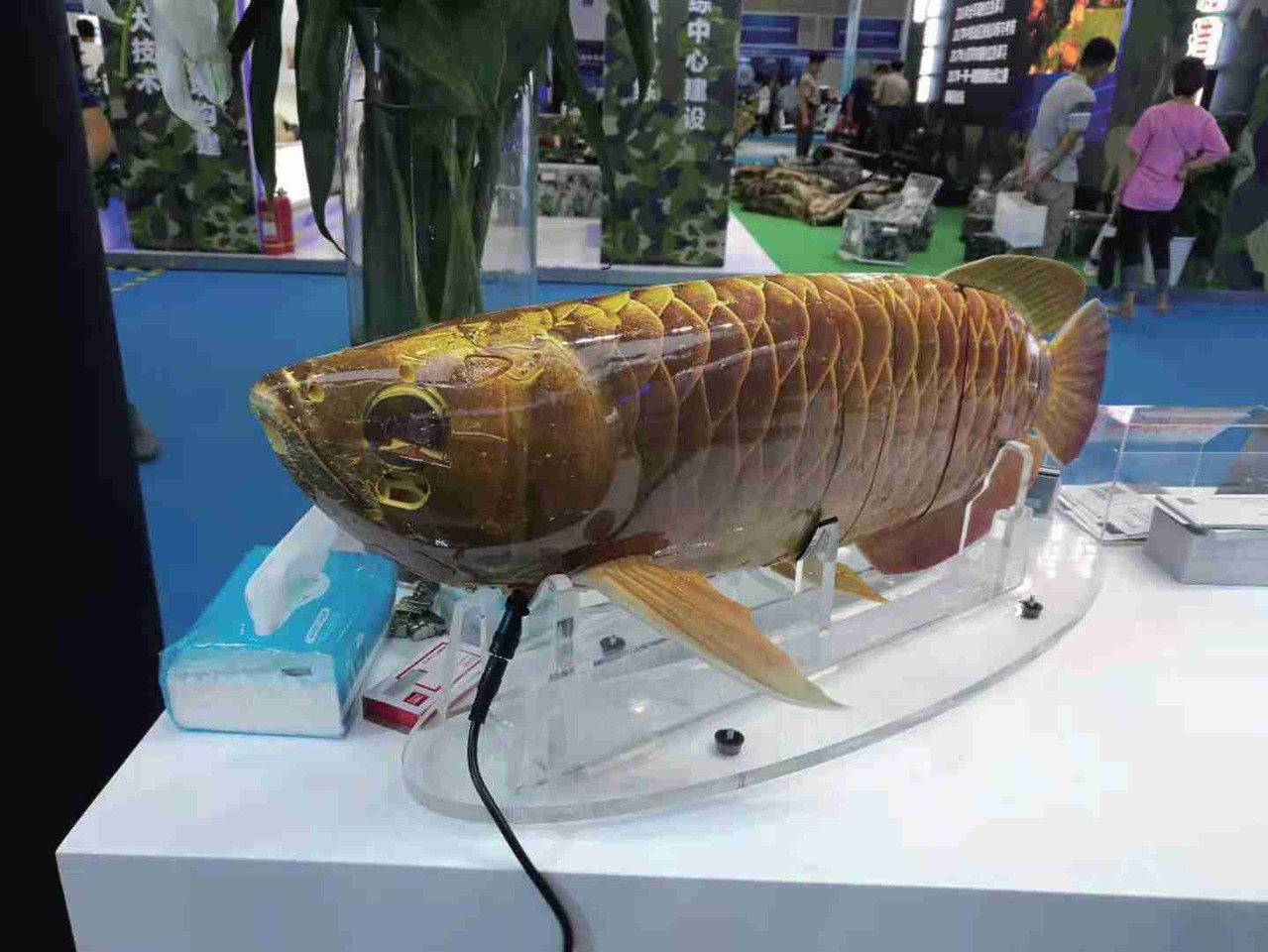此外,展場上的一尾「仿生金龍魚」在水池中來回游動,引起參觀民眾好奇。據了解,研發仿生魚的博雅工道公司根據金龍魚的游動姿態和外觀樣式,憑藉流體仿真技術設計而成,同時,仿生魚結合多種傳感器和全局視覺控制技術,能在水中連續游動6-8小時,可用於教育科研、海洋生物研究等多個領域。