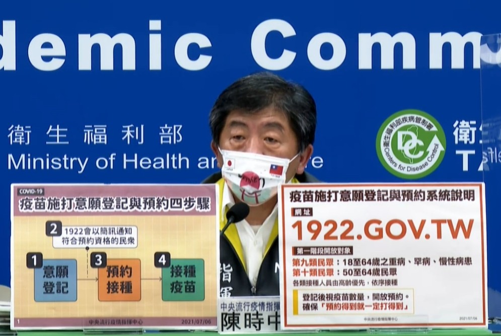 行政院政務委員唐鳳今在中央流行疫情指揮中心記者會說明疫苗意願登記預約系統,目前累計83萬4780人做意願登記。指揮官陳時中今也說明試辦時程,7/6離島、外島開始試行登記,7/8離島、外島開始試行預約,7/13全國第九、十類民眾登記,7月下旬全國第九、十類民眾開始分批預約。