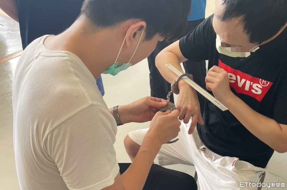 消防人員以器材破壞手銬結構後,順利協助男子脫困。(圖/記者黃孟珍翻攝)