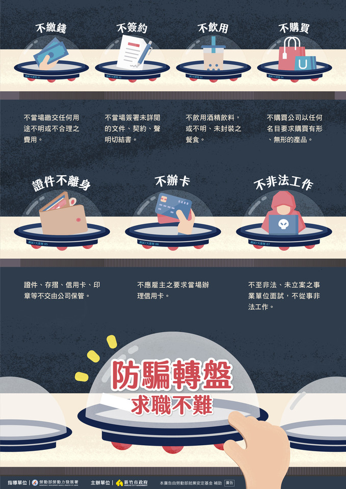 新竹市勞工處長黃錦源表示,求職詐騙已被列為十大熱門詐騙的類型之一,且詐騙手法推陳出新、防不勝防,他特別呼籲青年學子防範求職詐騙,一定要掌握「3備7不」原則。「三大準備」指的是事先蒐集應徵公司的資料、面試時可請家人朋友陪同或事先告知面試地點、檢視應徵資訊是否屬實;應徵時堅守「七不原則」:不繳錢、不購買、不辦卡、不簽約、證件不離身、不飲用、不非法工作。求職打工時,切勿隨意洩露或提供個人資料,即使是公司準備的飲料都不要喝,這樣才能保障隱私資料及人身安全,防範落入求職詐騙陷阱。