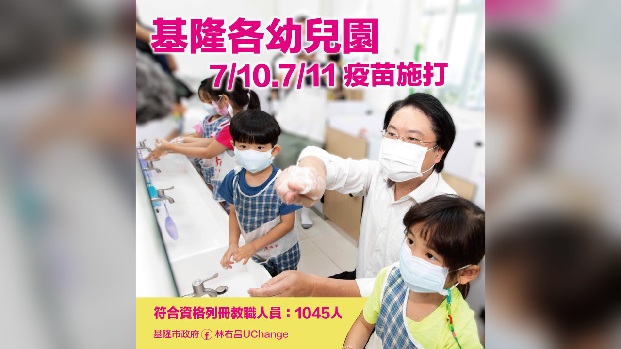 基隆市政府將於7月10、11日為105所幼兒園及2所兼辦國小兒童課後照顧中心共1045名教職員進行新冠疫苗施打,由教育處協助列冊,提升第一線托育人員保護力,維護本市幼兒健康!