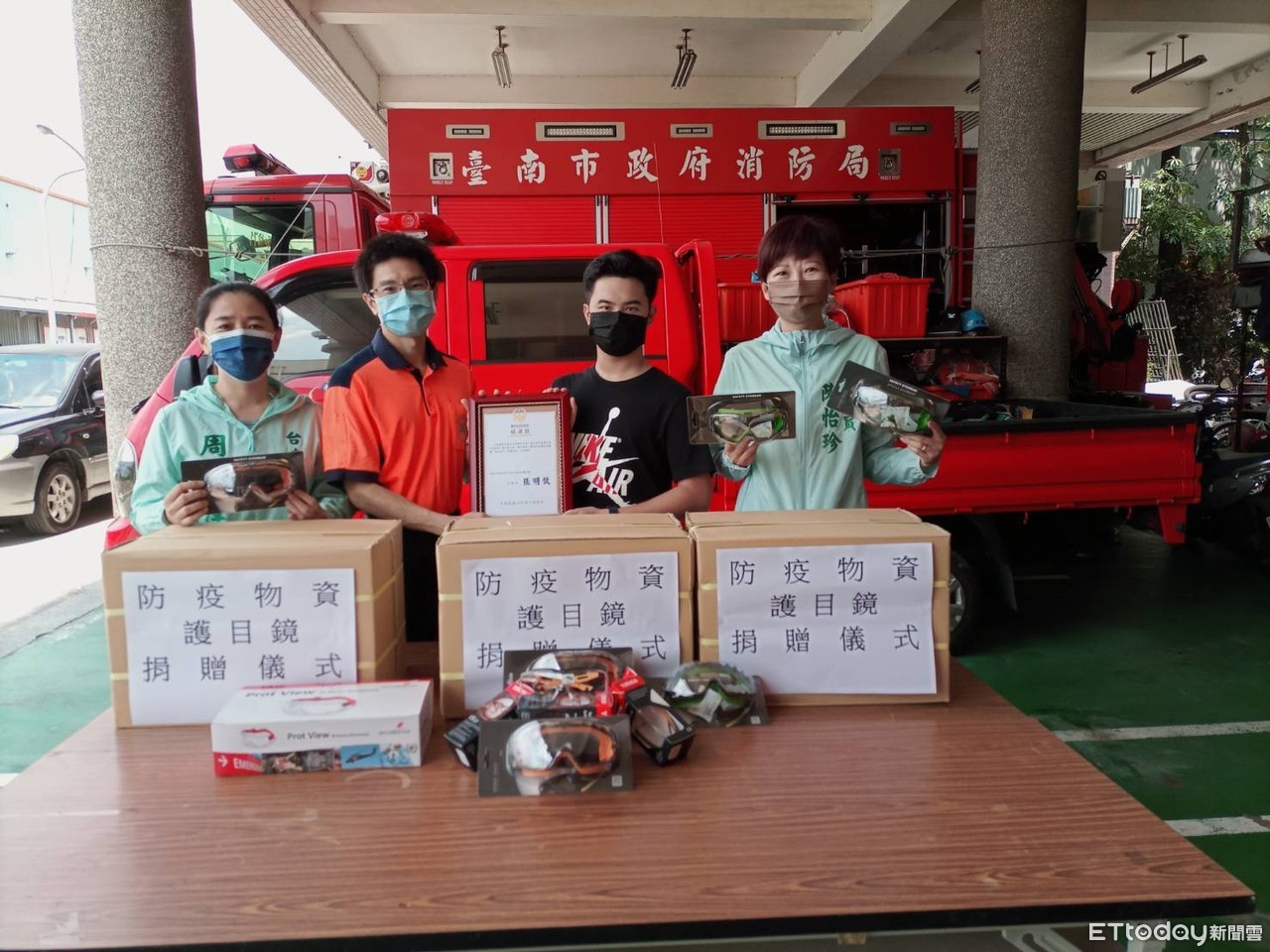 警消執勤防疫常暴露在高風險當中,防疫裝備需求量大,市議員陳怡珍、周麗津、鄭佳欣等人,8日媒合暖心廠商山水眼鏡公司、冠南眼鏡公司,捐贈1640個護目鏡給台南市政府消防局第五、六救災救護大隊及市警第二分局,供警消執勤時防護使用,盼讓辛苦的第一線執勤人員,更多一分保障,共同守護國人安全。