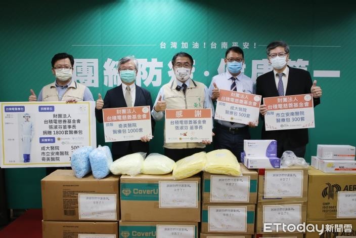 台積電慈善基金會在疫情嚴峻時期,即捐贈台南市政府「零接觸篩檢車」,讓醫護人員能在安全空間下進行採檢,強化台南市防疫篩檢量能。此次再捐贈第一線醫護人員最需要的髮帽、護目鏡、隔離衣、手套及鞋套等防護裝備,分別捐贈予奇美醫院500套、成大醫院500套、市立安南醫院300套,再加上先前台積電已捐贈奇美醫院500套防護裝備,總計共捐贈1800套防護物資,捍衛醫護人員的工作安全。
