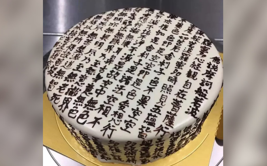 其實日本大阪一間蛋糕店,也曾收到客人要求,訂製一款「般若波羅蜜多心經蛋糕」,要送給女友當生日禮物,店長花了整整2小時才完成,並將成品上傳推特,網友看了都不認為收到的人會喜歡,還紛紛留言,「吃完立地成佛」、「施主還活著嗎」、「這個吃完感覺都被超渡了」、「這是要插蠟燭好還是插香好?」、「還是他就想超渡女友?」。